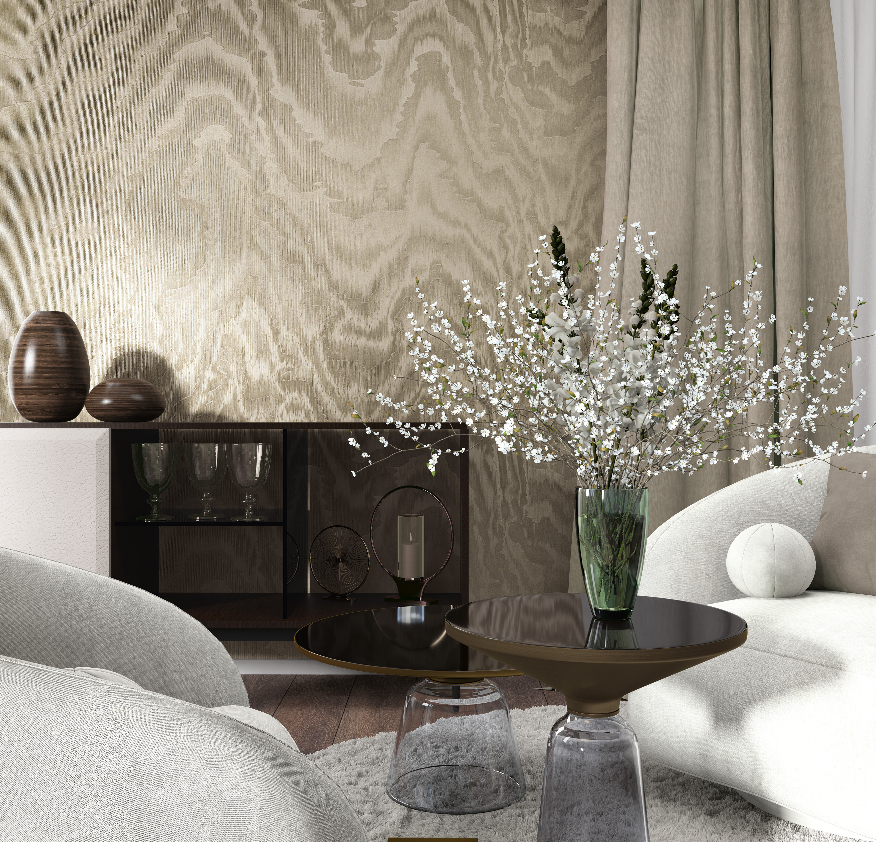 Среди дизайнов коллекции вы найдете обои с переливающимися вставками, создающими игру света и тени, что добавляет интерьеру изящности и неповторимости. Эти обои являются идеальным решением для тех, кто ценит оригинальность и изысканный вкус в дизайне интерьера.
